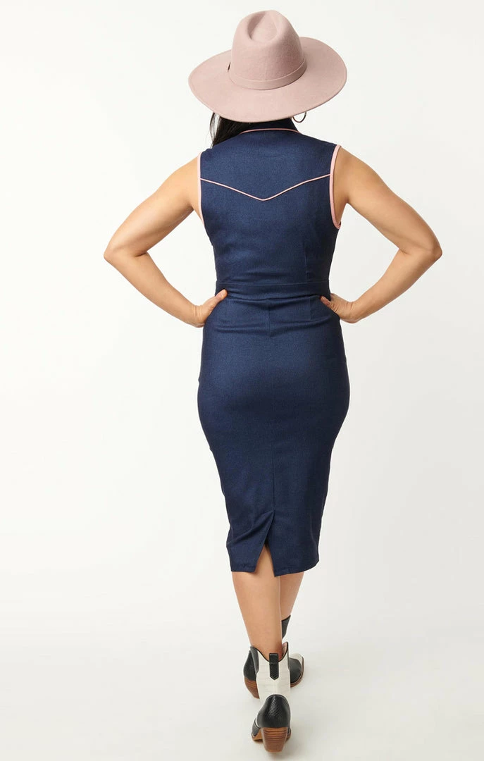 Every rodeo needs a queen, now’s your time to shine! This fabulous Western Fringe Wiggle Dress from Unique vintage is crafted in a flattering stretch denim and features pink piping, black fringe details, and pretty black rose buttons. The buttons are functional and the side zips to fasten. Vent at the back helps with ease of movement. Just add your favorite boots and you’re set!