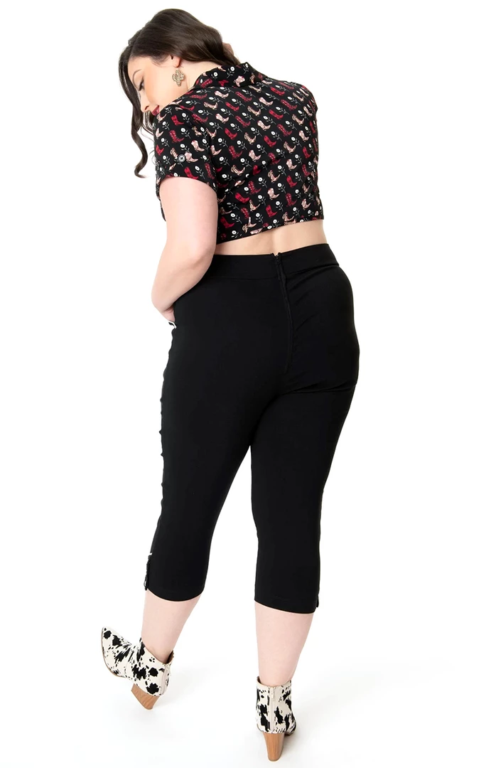 Round up the posse! These fabulous Western Clementine Capris from Unique Vintage are crafted in a marvelous black bengaline to hug your natural assets as you take the bull by the horns. They feature a banded waist, cinched with a back zipper while pearlescent snap buttons provide notched cuffs and belt loops. White piping highlights the functional scalloped side pockets for a little western flair!