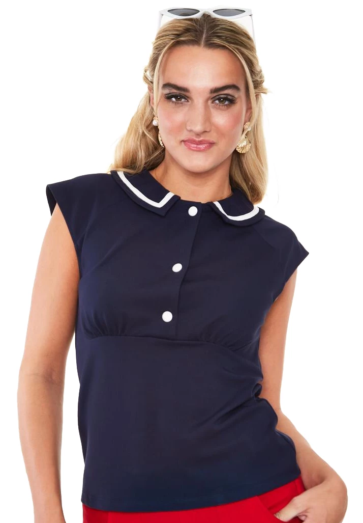 Luck be a Lady in this darling collared top from Voodoo Vixen! The Lady Top in classic navy is made of a soft and structured knit blend with a high seamed waist for a retro perfect fit. It features a trimmed in white collar with a trio of matching white buttons for a nod to nautical, and works well with trousers and skirts alike!