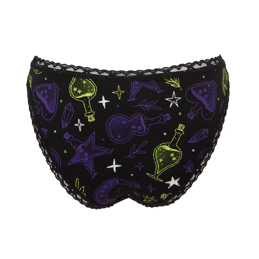 Create some magic in the Magic Night Panties from Killstar! Conjured from a soft and stretchy fabric with an all over potion bottle statement print in purple and green with lace trim accents.
