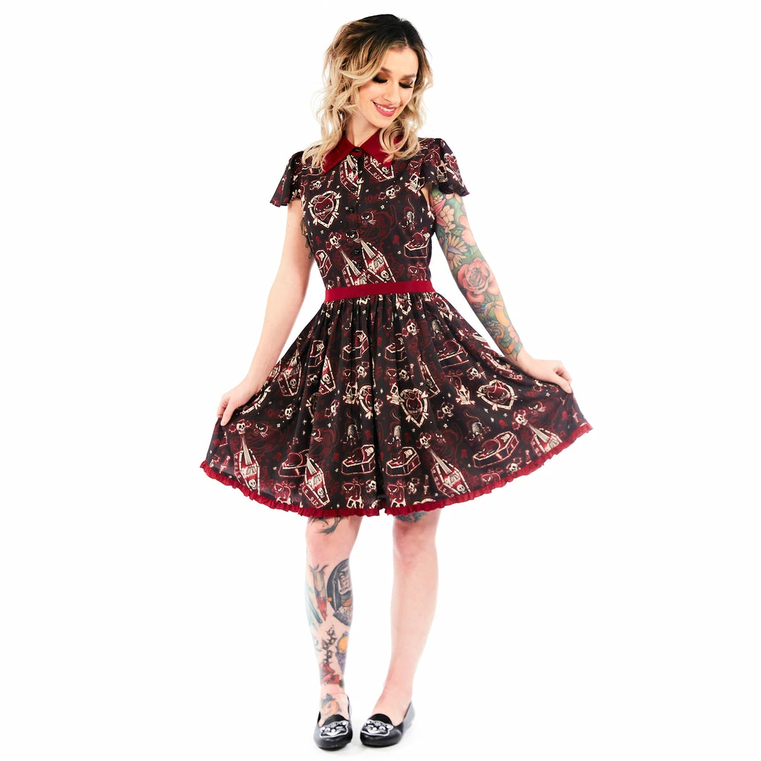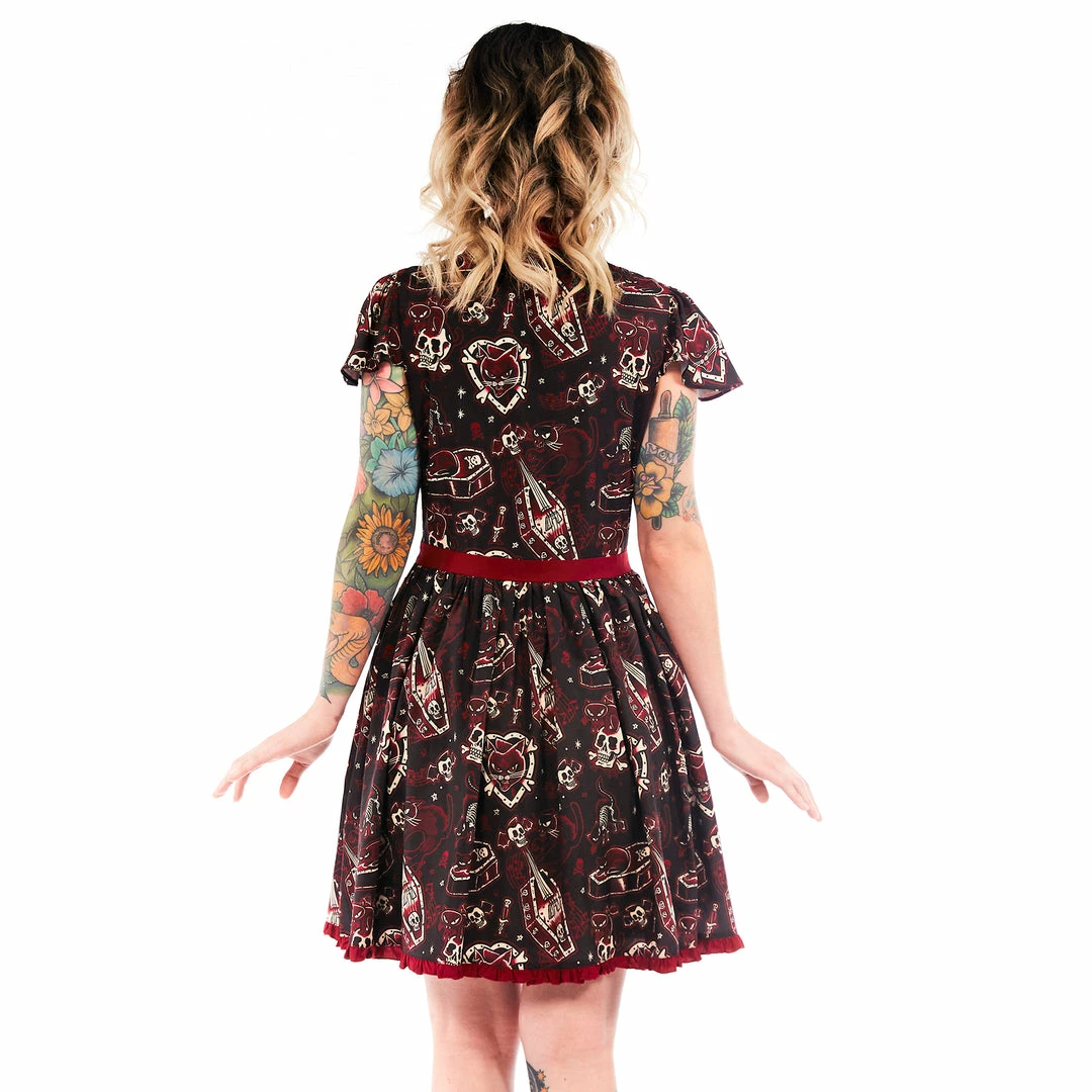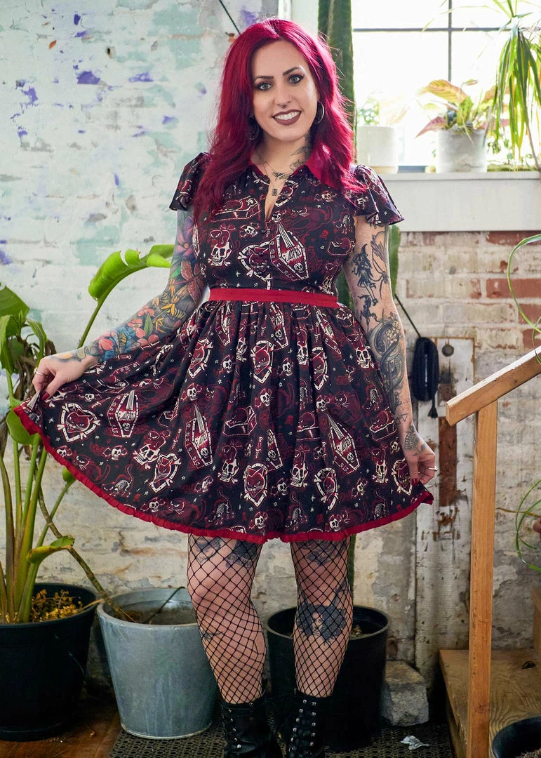 To our fellow cat ladies, this one is for you!! The Cat Lady Lydia dress features the most AMAZING artwork by Sol Rac, and has everything – black cats, coffins, skulls, and more! The Lydia dress has flutter sleeves, a button front closure, and an invisible side zipper. It’s also fully lined and has POCKETS!