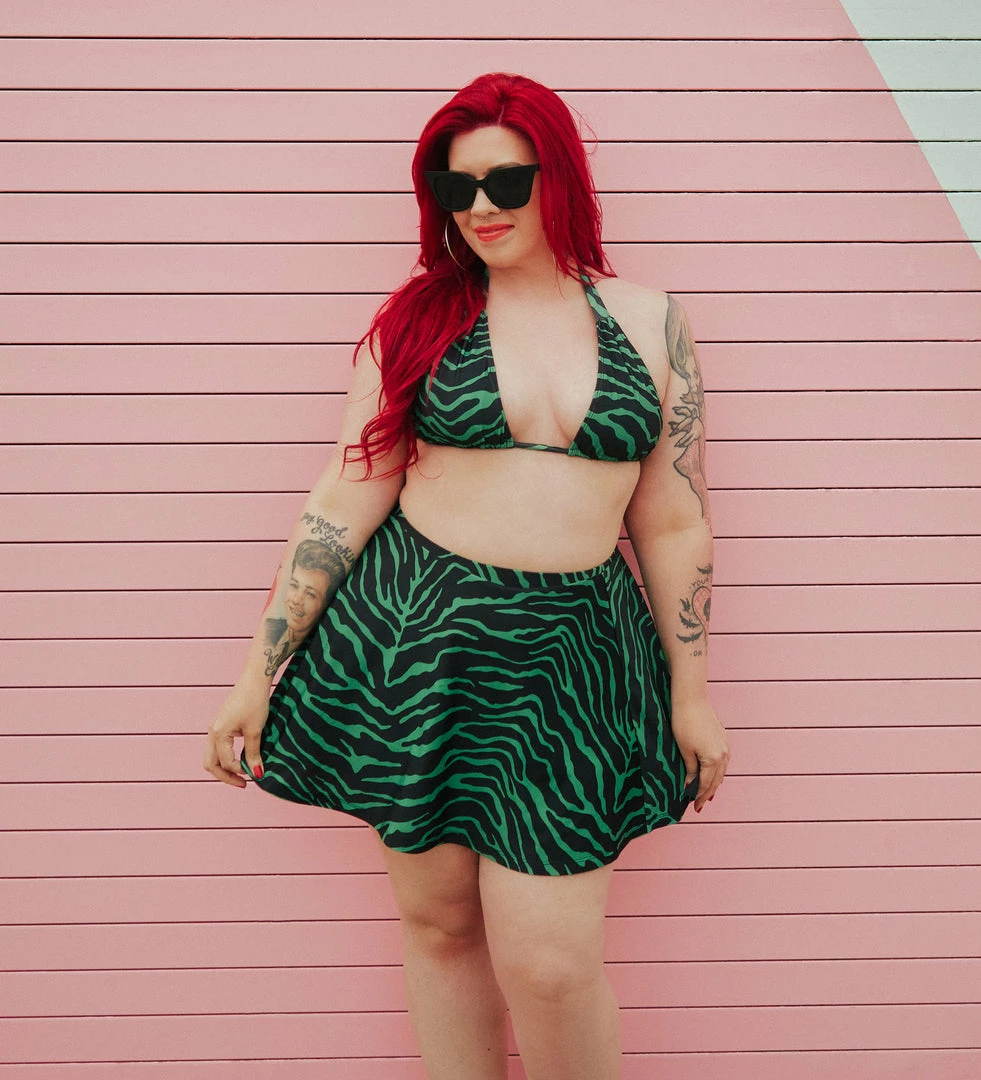Your favorite new Summer staple has arrived! Our new swim skirts not only match our new Monokinis and Scrunch Bikinis perfectly, they also look amazing on their own! The Green Zebra swim skirt would look amazing paired with a black body suit or crop top and fishnets!