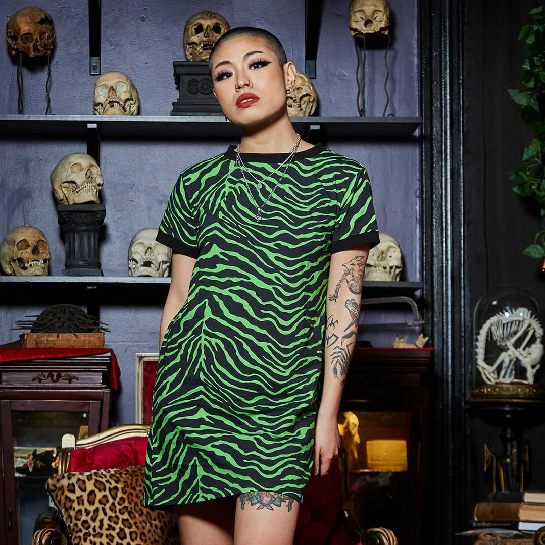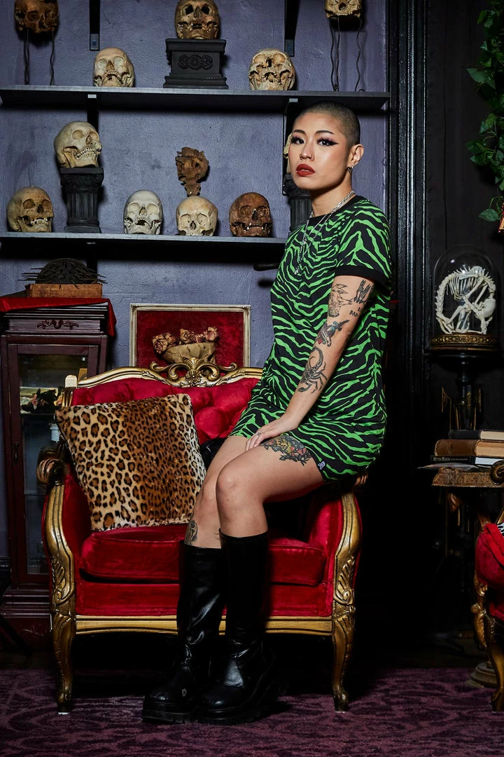 The Zebra print of your dreams is here! Be cozy at home or on the go in the new Psycho Zebra Ringer Tee dress. This dress has a more relaxed fit, with contrast black rib on the neck and sleeves, and a Sourpuss label at the hem.